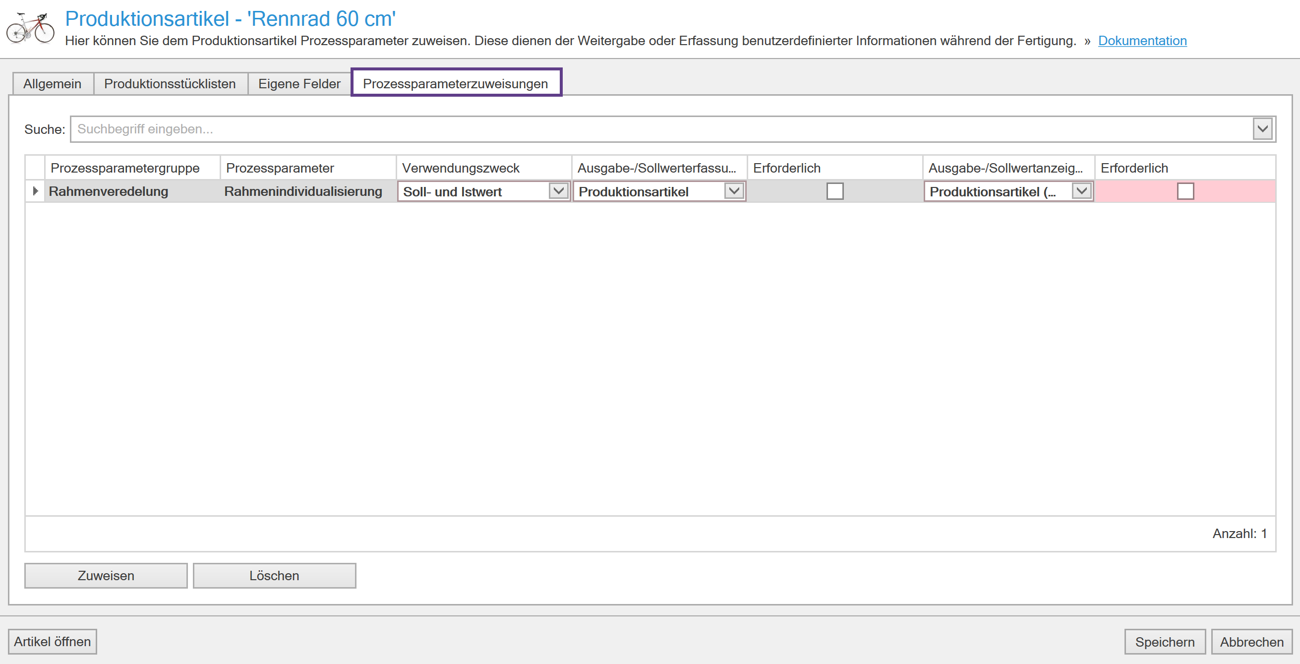 Zuweisen: Klicken Sie auf diese Schaltfläche, um dem Produktionsartikel einen Prozessparameter zuzuweisen. Diesen Prozessparameter müssen Sie vorab im Menü von JTL-Wawi unter Admin > Prozessparameter angelegt haben. Lesen Sie mehr zum Thema hier: Detailbeschreibung: Prozessparameter.