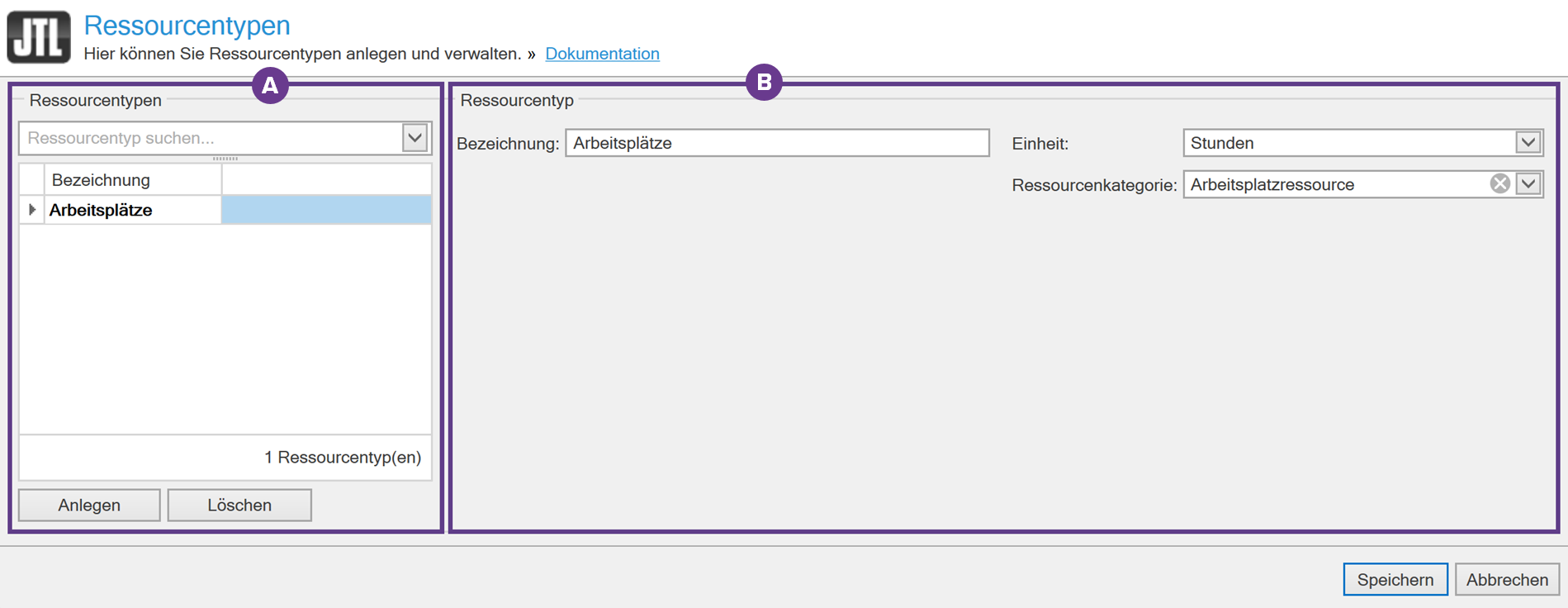 In dieser Dokumentation lesen Sie eine Detailbeschreibung der Funktionen im Dialogfenster Ressourcengruppen. Sie erreichen das Dialogfenster in JTL-Wawi über das Menü Produktion > Ressourcen > Ressourcentypen.