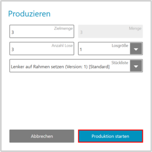 - Sofern Sie noch Änderungen vornehmen möchten, können Sie dies in den entsprechenden Feldern des Dialogs Produzieren tun. Die vorab ausgewählte Zielmenge, Anzahl der Lose, Losgröße und die Stückliste ergeben sich aus dem Auftrag.
