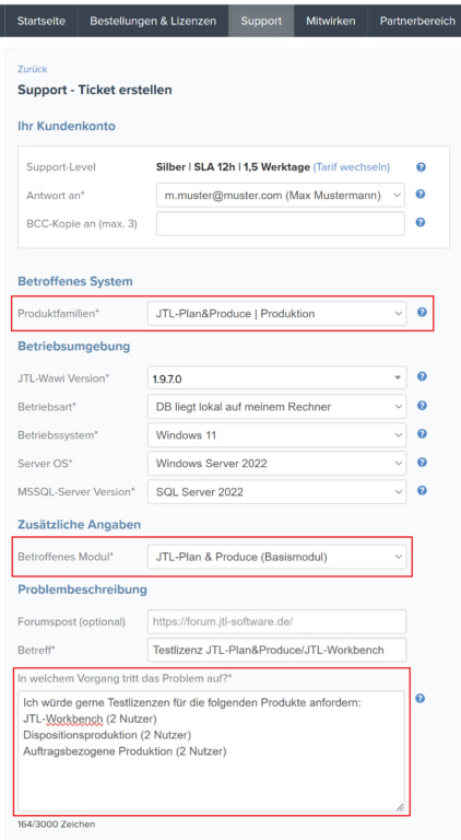 - Hinterlegen Sie alle Pflichtangaben und führen Sie in einem der Textfelder auf, welche Lizenzen Sie explizit testen möchten (JTL-Workbench, Anzahl der Nutzer, Module).