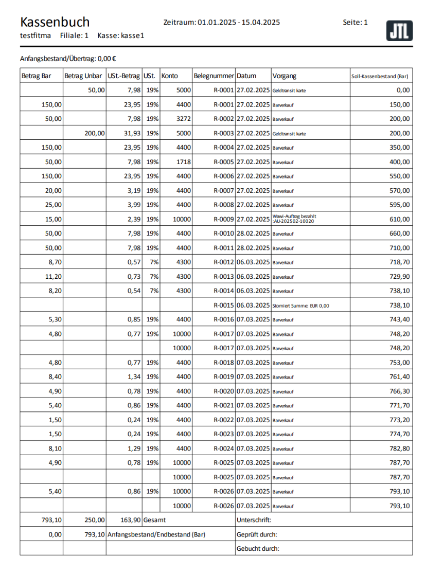 Mit der Option Kassenbuch für alle Belege erstellen haben Sie zusätzlich die Möglichkeit, ein Kassenbuch für alle Vorgänge zu erstellen. Neben den Barzahlungen sind hier zum Beispiel auch Karten- oder Gutscheinzahlungen vermerkt.