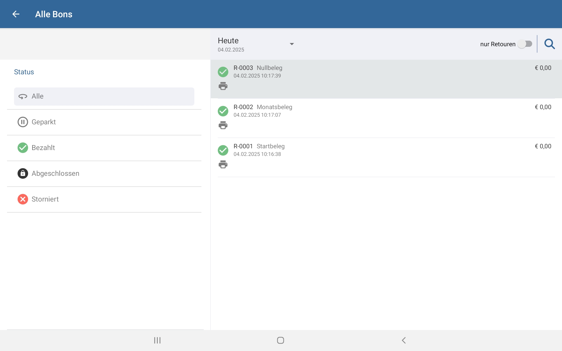 - Tippen Sie in der Hauptansicht oder beim Erstellen eines neuen Bons auf den Menüpunkt Alle Bons. Eine Liste aller Belege wird angezeigt.