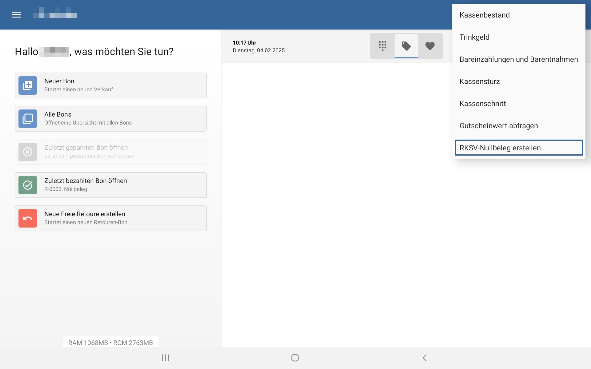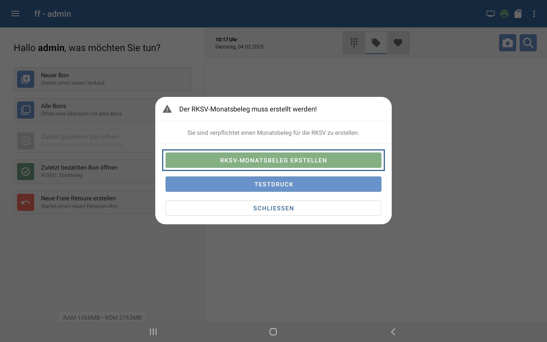 - Tippen Sie auf den Menüpunkt Neuer Bon. Wenn dieser neue Bon der erste Bon des Monats ist, sehen Sie das Dialogfenster Der RKSV-Monatsbeleg muss erstellt werden!