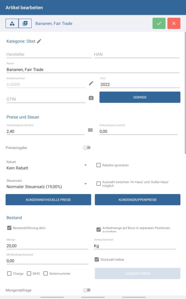 - Hinterlegen Sie eine Bezeichnung, eine PLU, den Grundverkaufspreis und eine Einheit.