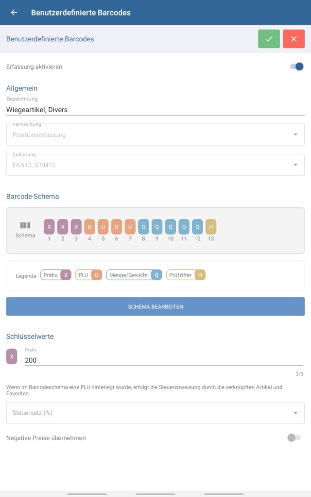 - Speichern Sie das Barcode-Schema mit dem grünen Häkchen oben rechts.