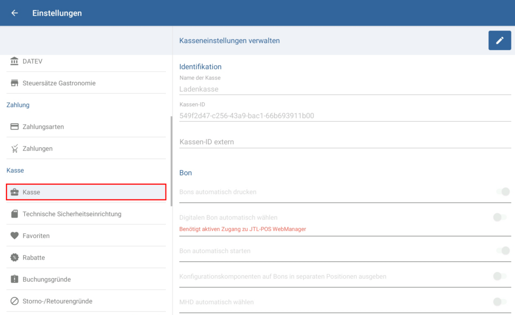 Kasseneinstellungen verwalten