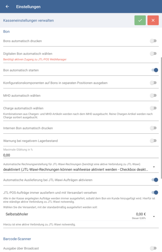 Ausgabe über Broadcast: Aktivieren Sie diese Option, um den Barcode-Scanner über die Broadcast-Methode von Android anzusprechen. Auf diese Weise werden die gescannten Daten direkt und ohne Umweg in JTL-POS eingelesen.
