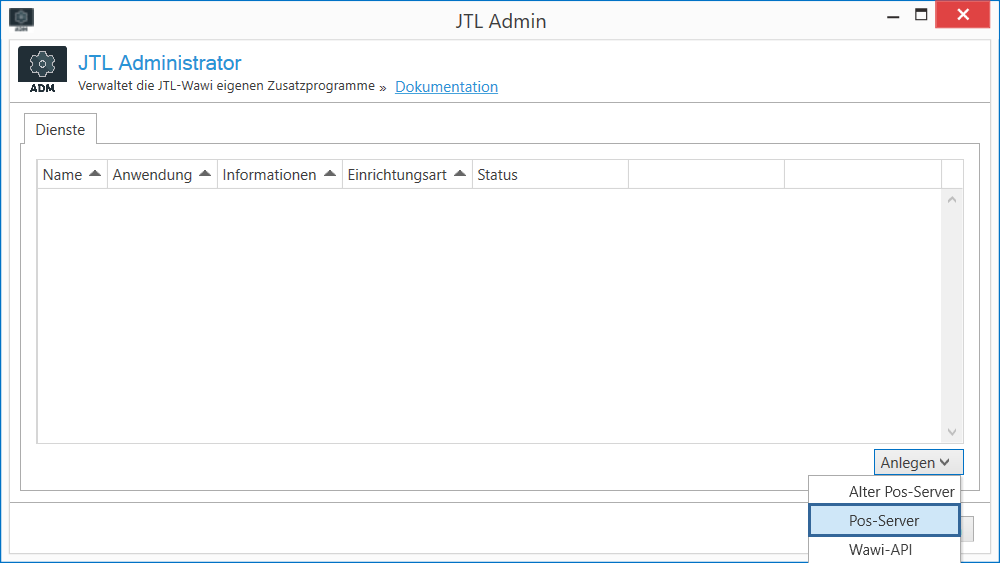 - Klicken Sie im neuen Dialogfenster JTL-Administrator auf die Schaltfläche Anlegen und wählen Sie im ausgeklappten Dropdown-Menü die Option Pos-Server.