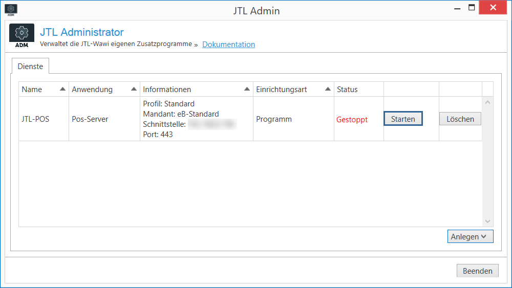 - Sie gelangen zurück zum Dialogfenster JTL-Administrator. In der Registerkarte Dienste sehen Sie jetzt die Instanz für den Pos-Server. Klicken Sie auf die Schaltfläche Starten.