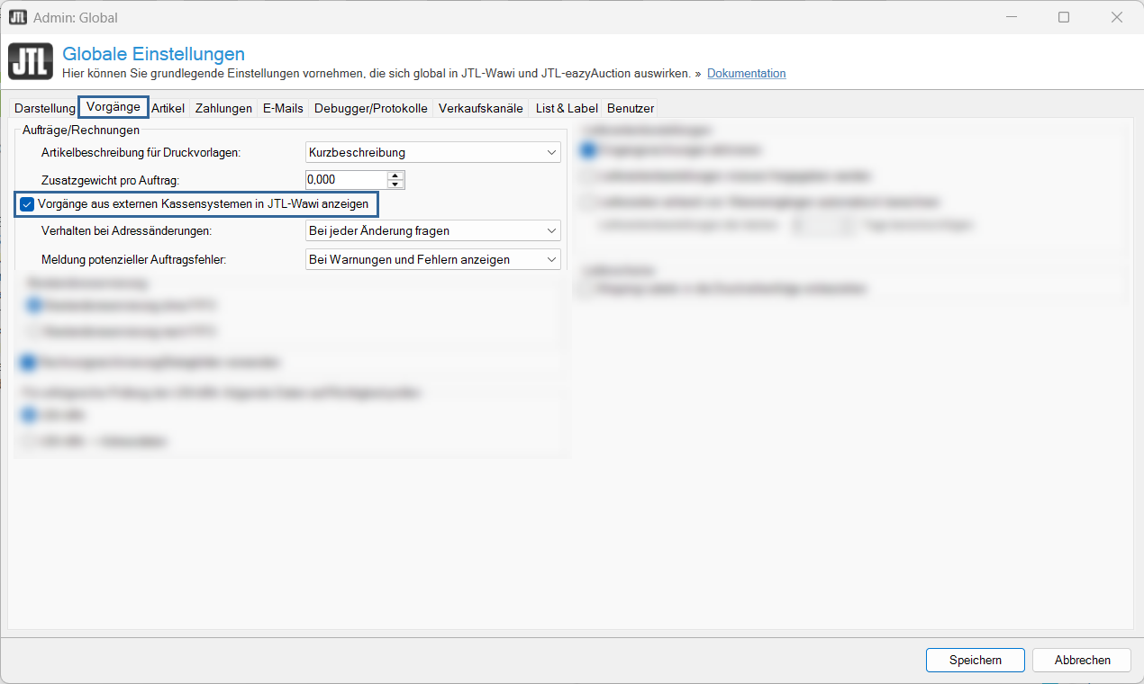 - Aktivieren Sie im Bereich Aufträge/Rechnungen die Checkbox Vorgänge aus externen Kassensystemen in JTL-Wawi anzeigen.