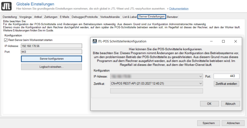 - Klicken Sie auf die Schaltfläche Server konfigurieren. Das Dialogfenster JTL-POS Schnittstellenkonfiguration öffnet sich.