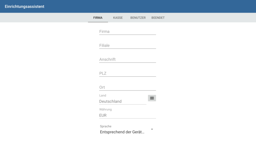 - Geben Sie auf der Seite Firma die Daten für Ihre Firma und die Filiale, in der sich die Kasse befindet, an. Falls Sie die Kasse mobil benutzen, geben Sie Ihren Firmen-Standort als Filialstandort ein. Sie können diese Daten später unter Firmeneinstellungen verwalten bearbeiten.