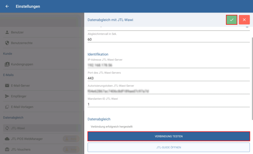 - Tippen Sie in JTL-POS auf das Hakensymbol. Ihre Angaben werden gespeichert.
