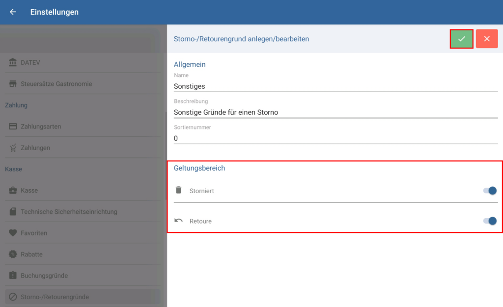 1. Tippen Sie auf das grüne Haken-Symbol, um das Dialogfenster zu schließen. Der Storno-Retourengrund ist jetzt angelegt und steht Ihnen in der Kasse zur Verfügung.