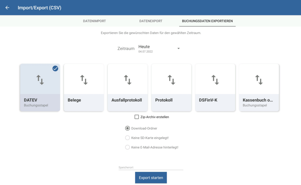 DSFinV-K: Wählen Sie diese Option, um alle Buchungsdaten für den gewählten Zeitraum für die Digitale Schnittstelle der Finanzverwaltung für Kassensysteme (DSFinV-K) zu exportieren.