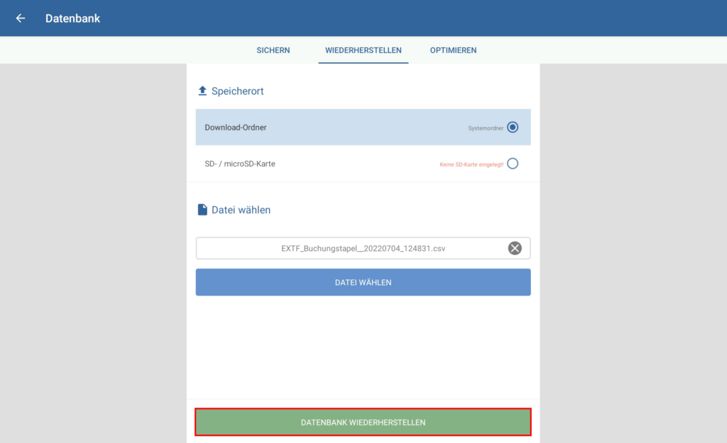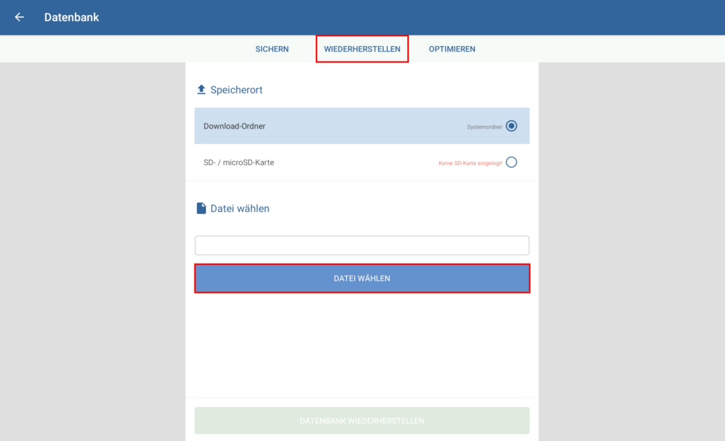 2. Wählen Sie aus, von welchem Speicherort die Datensicherung bezogen werden soll. Zur Verfügung stehen Ihnen die Optionen Download-Ordner oder SD-/microSD-Karte.