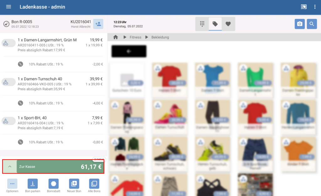 Optional: Geben Sie einzelnen Positionen oder dem gesamten Bon einen Rabatt. Lesen Sie mehr zum Thema hier: Rabatte auf Positionen und Bons gewähren
