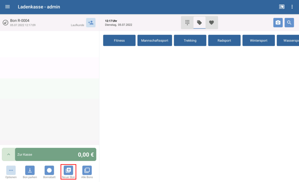 - Tippen Sie in der Kassieransicht auf die Schaltfläche Neuer Bon. Ein neuer Bon wird angelegt.