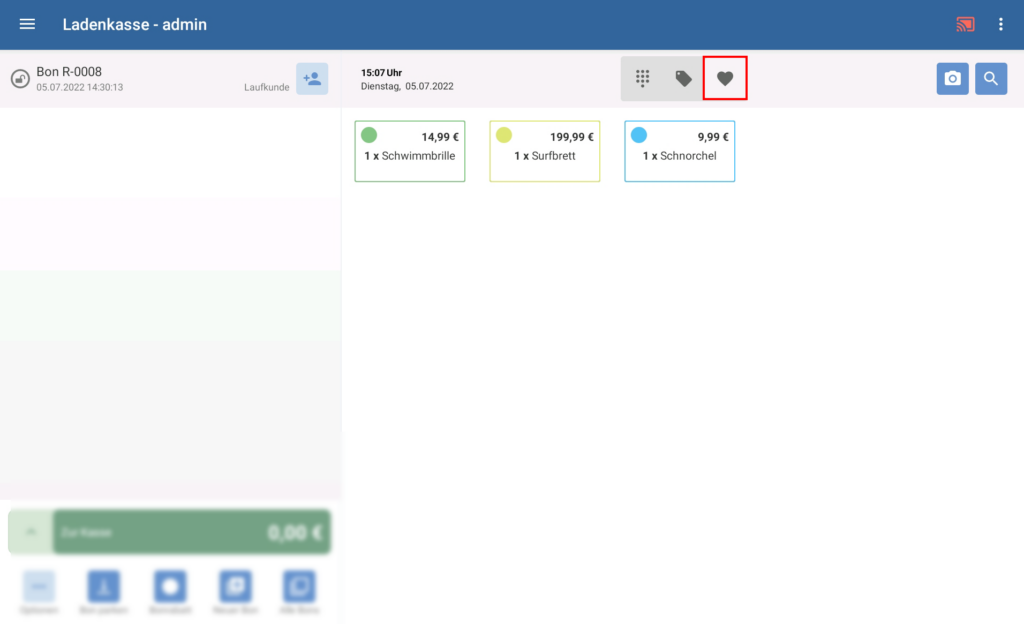 Sie haben die Möglichkeit, Artikel aus der Favoritenliste auf den Bon zu setzen. Unter Einstellungen > Favoriten können Sie beispielsweise häufig verkaufte Artikel als Favoriten definieren, um in der Auswahl auf diese zugreifen zu können.