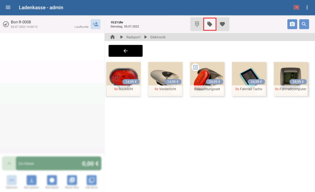 Mithilfe der Suchfunktion können Sie zu einem Artikel navigieren und ihn dann auf den Bon setzen.