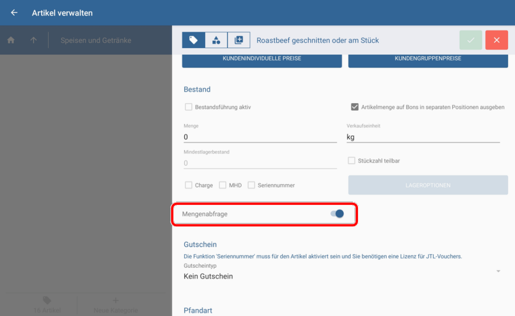 Wenn Sie Ihre Artikel über JTL-POS pflegen und eine Mengenabfrage aktivieren möchten, gehen Sie folgendermaßen vor: