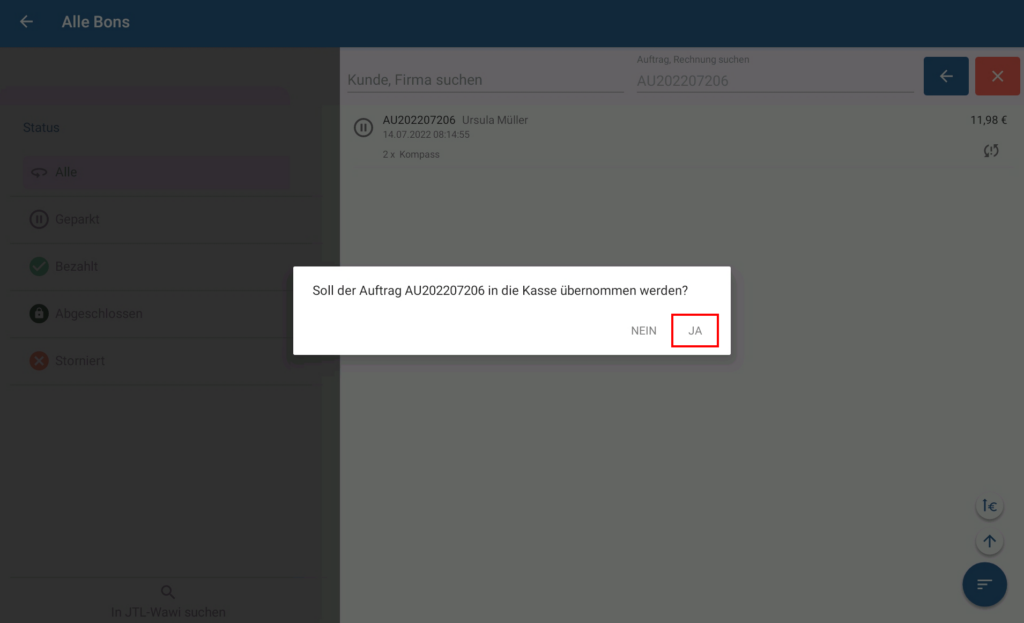 - Tippen Sie auf den Auftrag, den Ihr Kunde bezahlen möchte. Es erscheint eine Abfrage, ob Sie den Bon in die Kasse übernehmen möchten.