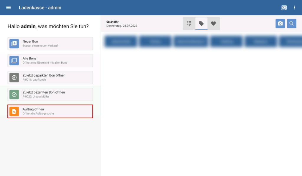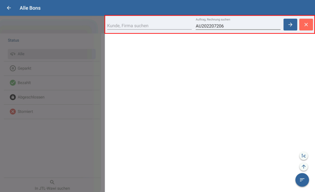 - Öffnen Sie JTL-POS und tippen Sie auf die Schaltfläche Auftrag öffnen. Die Suchoptionen öffnen sich.