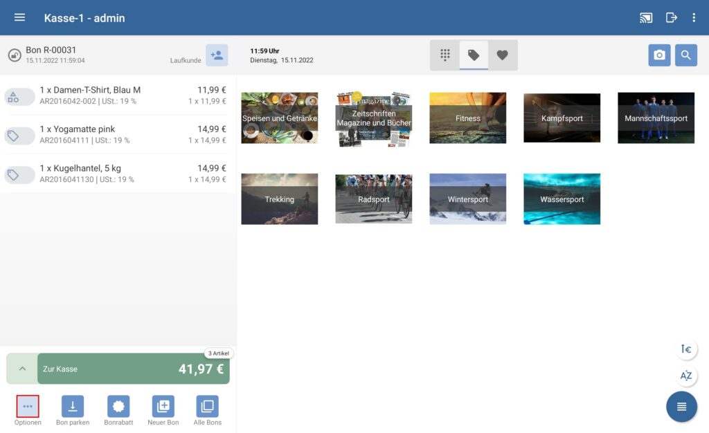 - Klicken Sie in der Kassieransicht auf die Schaltfläche Optionen.
