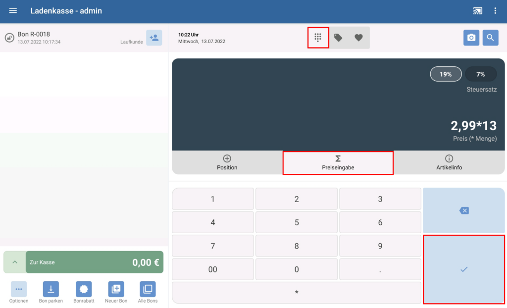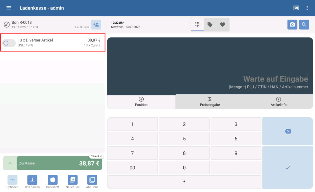 Hinweis: Wenn Sie nach der Preiseingabe die Schaltfläche * tippen, können Sie die Menge eingeben, in der der Diverse Artikel auf den Bon gesetzt werden soll, beispielsweise 2,99*13. Durch diese Eingabe wird der Diverse Artikel für 2,99€ 13 Mal auf den Bon gesetzt.