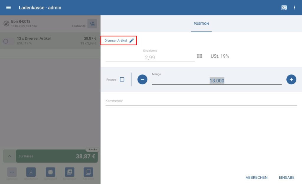 Sie haben die Möglichkeit, einen Diversen Artikel zu bearbeiten, bevor Sie ihn kassieren. Das ist beispielsweise sinnvoll, wenn Ihre Kunden den Namen der Position auf dem Bon sehen sollen.