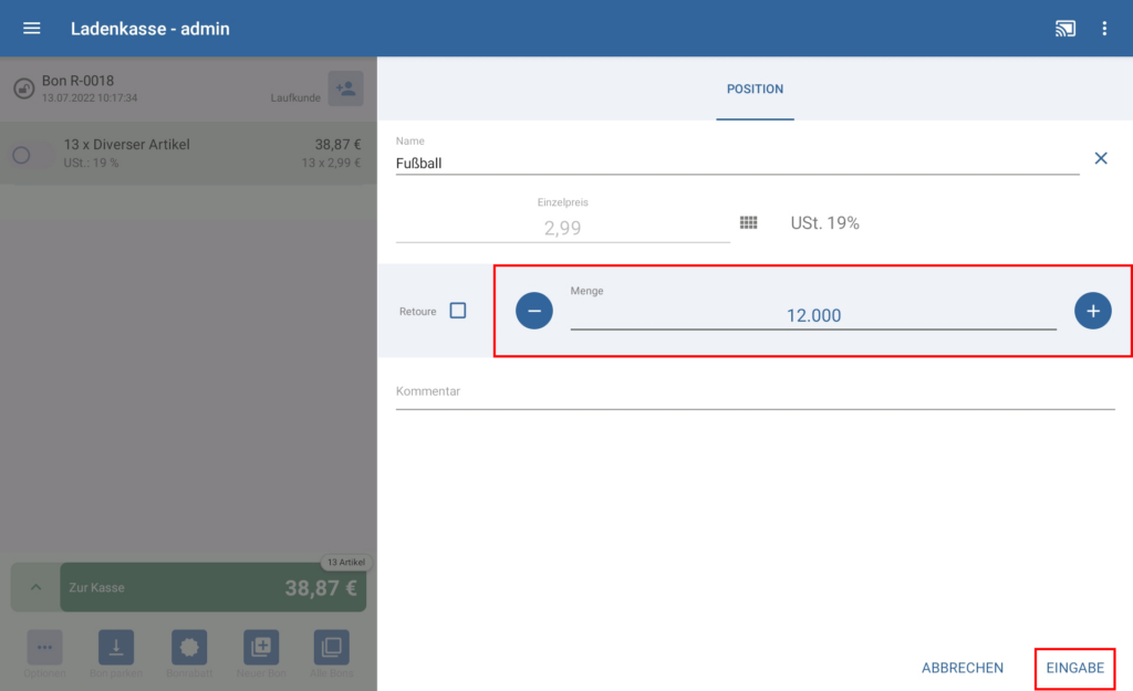 Die Änderungen werden übernommen. Sie können den Kassiervorgang wie gewohnt fortsetzen.