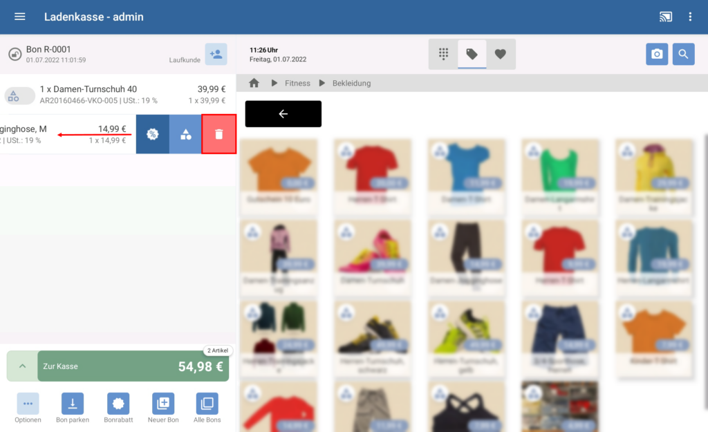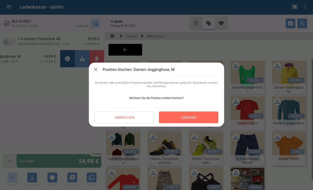 - Bestätigen Sie die Abfrage mit Löschen. Die Position wird vom Bon entfernt.