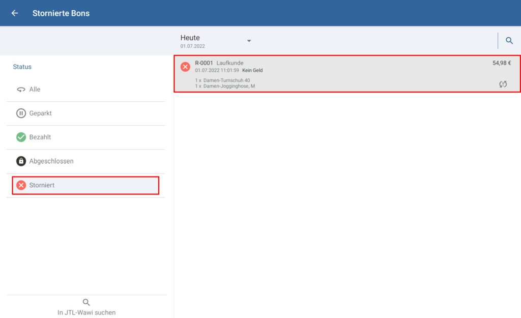 Bis zum Tagesabschluss finden Sie auf diese Weise stornierte Bons in der Übersicht Alle Bons > Storniert.