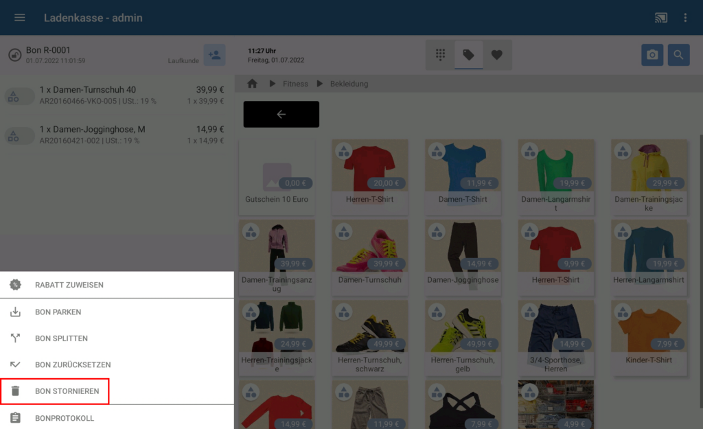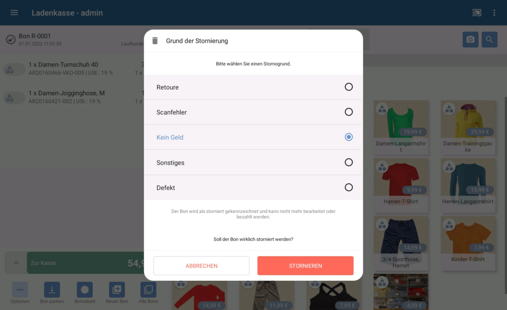 - Wählen Sie einen der Stornogründe bzw. bestätigen Sie die Abfrage. Der Bon wird storniert.