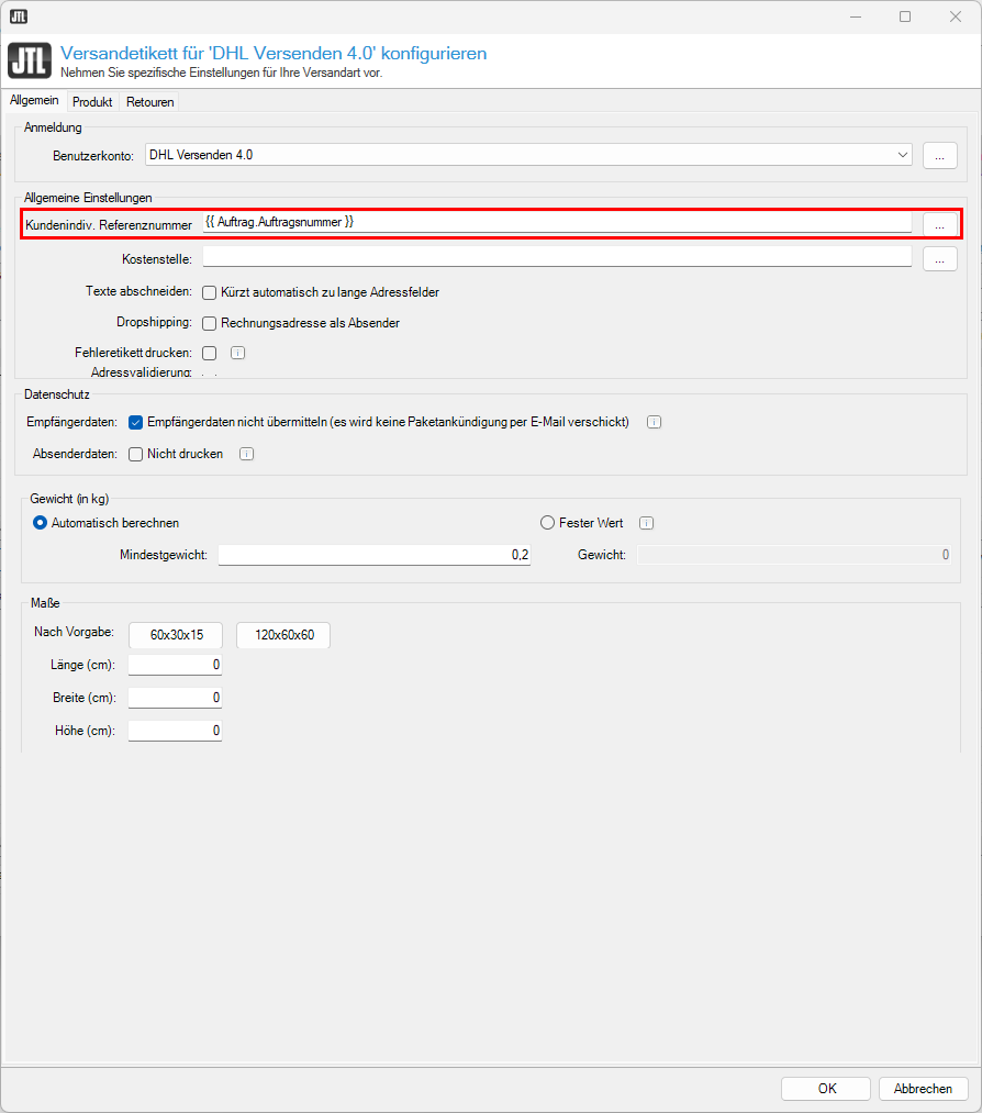 Diese Referenz tragen Sie in JTL-ShippingLabels in Ihrem Benutzerkontounter Absenderreferenz ein, wenn Sie die Option Aus Portal übernehmen wählen.