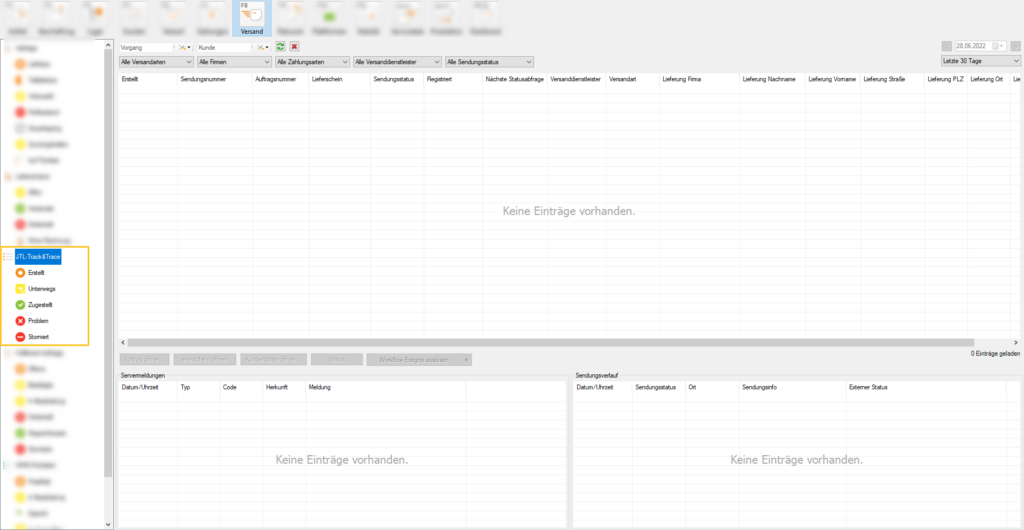 - Wechseln Sie in JTL-Wawi über das Menü Versand > JTL-Track&Trace in das Dialogfenster JTL-Track&Trace einrichten.