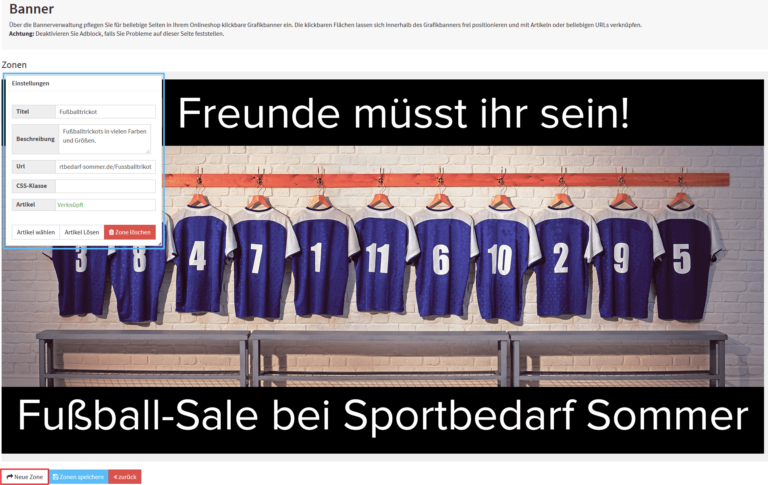 Es können beliebig viele Zonen innerhalb des Banners angelegt werden. Das sind Klickbereiche, die beim Überfahren mit der Maus hervorgehoben werden. Die Zonen können frei positioniert werden und sind in Höhe und Breite frei skalierbar.