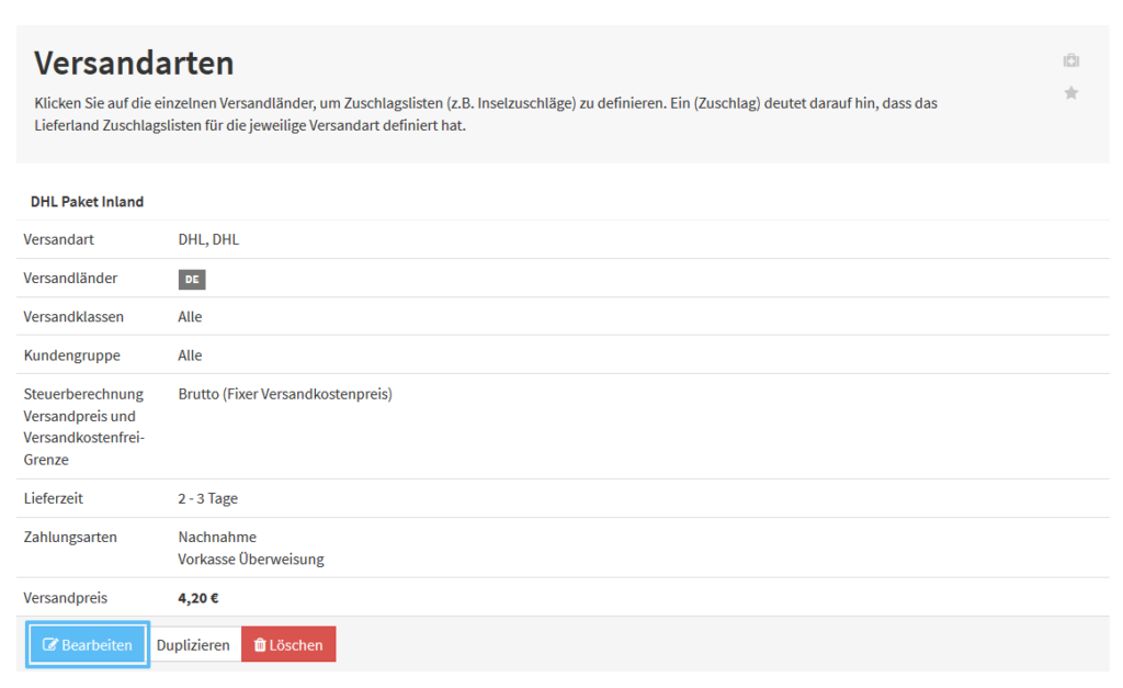 2. Wählen Sie den Logistikdienstleister aus, bei dem Sie die Zahlungsart BillPay verwenden möchten und klicken Sie auf die Schaltfläche Bearbeiten.