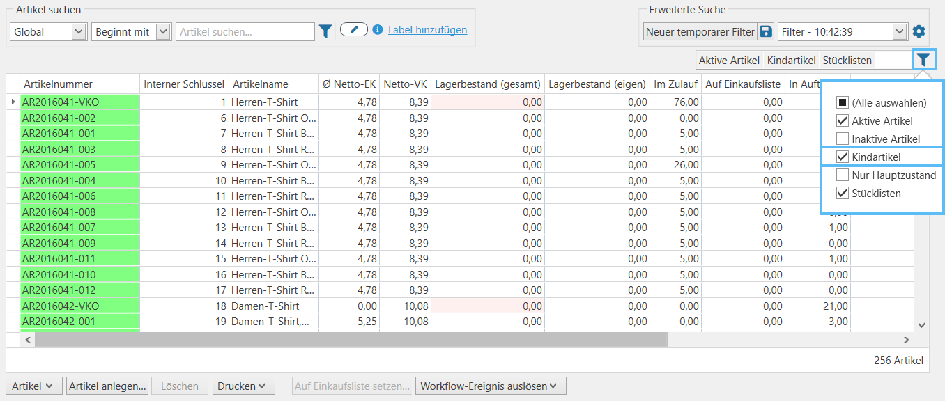 - Optional: Klicken Sie auf das Filtersymbol und aktivieren Sie Kindartikel, wenn Sie Artikel mit Variationskombinationen in Ihrem Onlineshop verkaufen.
