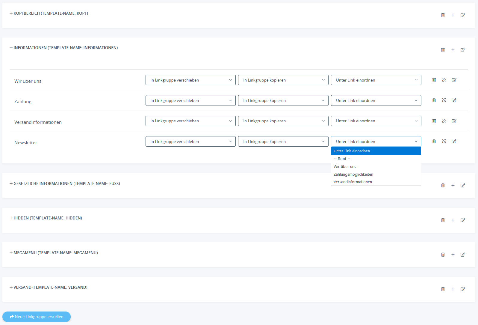 - Klicken Sie auf den Pfeil im Dropdown-Menü In Linkgruppe verschieben. Sie sehen eine Liste aller vorhandenen Linkgruppen in JTL-Shop.
