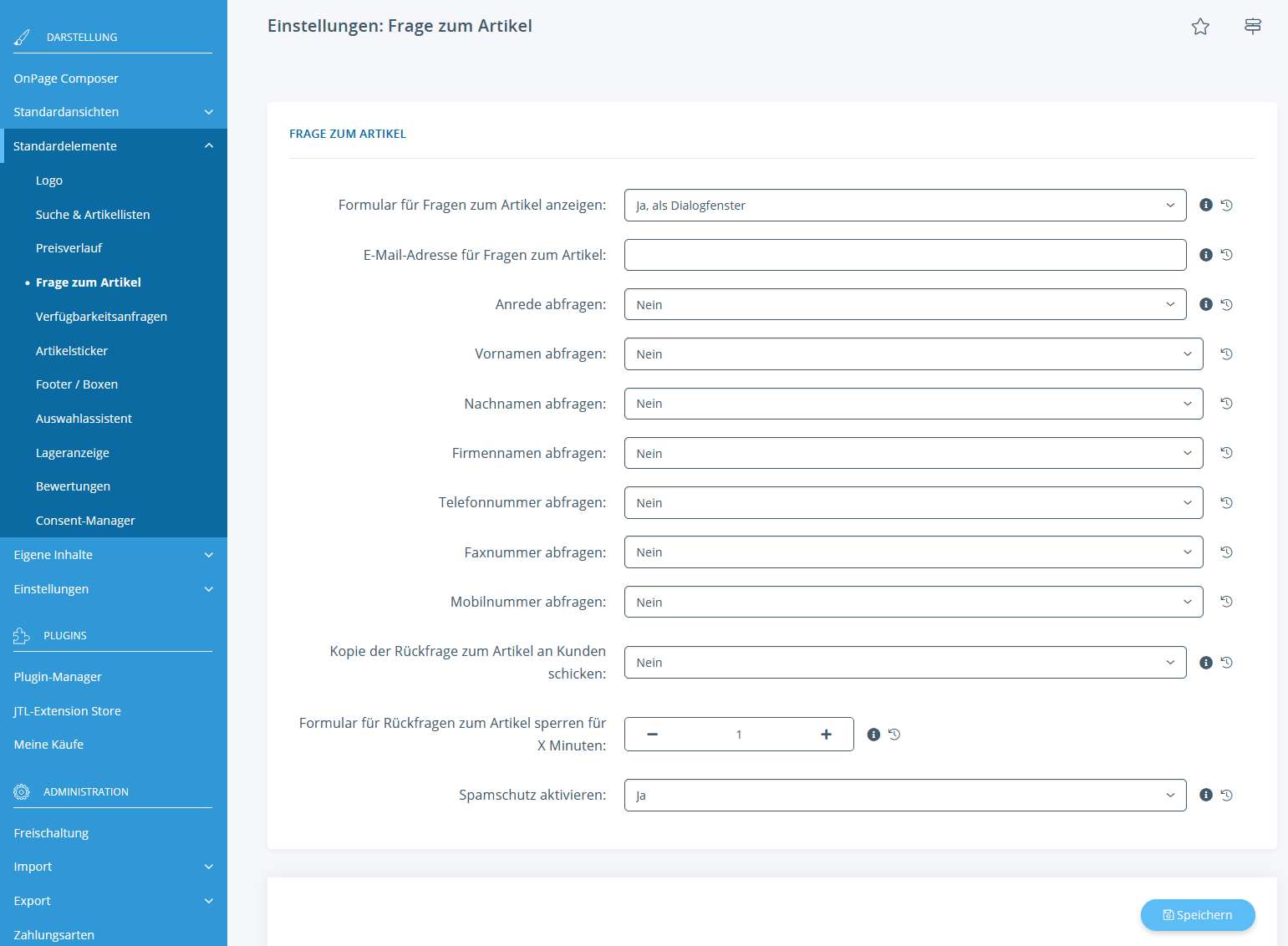 In dieser Dokumentation lesen Sie eine Detailbeschreibung der Funktionen auf der Seite Einstellungen: Frage zum Artikel. Sie erreichen diese Seite im Backend von JTL-Shop unter Darstellung > Standardelemente > Frage zum Artikel.