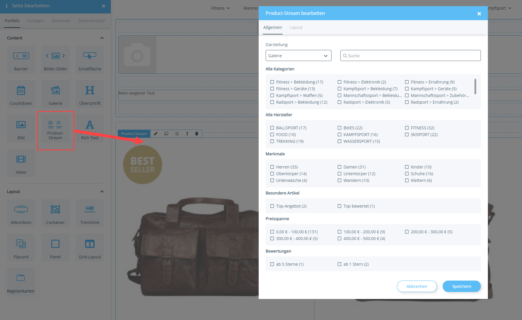 - Ziehen Sie das Portlet Product-Stream im OnPage Composer an eine beliebige Stelle. Es öffnet sich das Fenster Product-Stream bearbeiten.