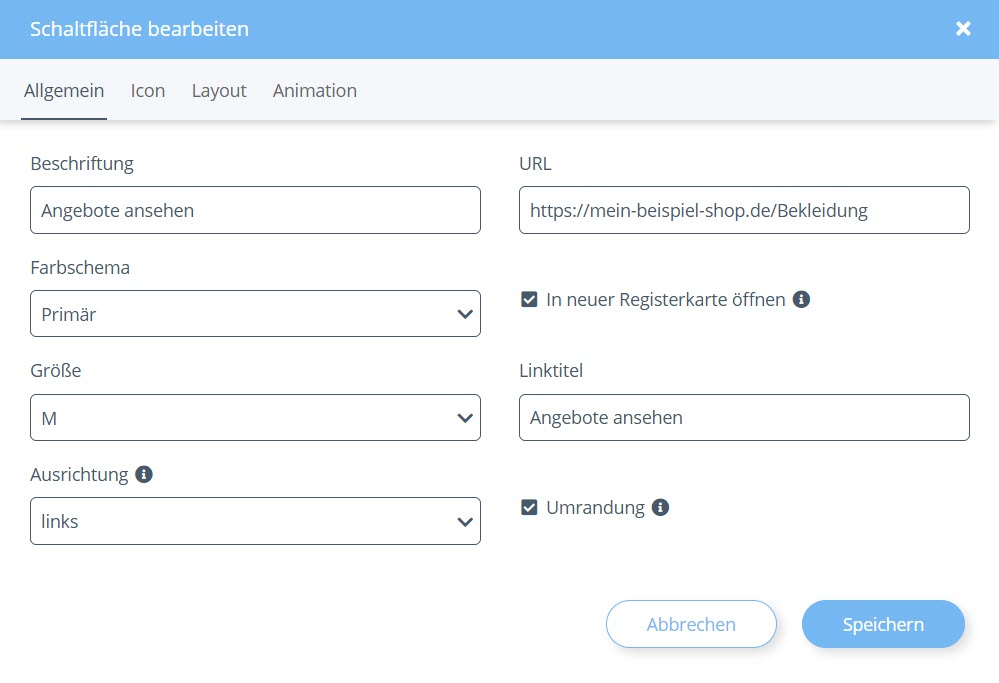 Detail: Wenn Sie eine detailliertere Beschreibung der Einstellungen in den Registerkarten Allgemein, Icon, Layout und Animation benötigen, lesen Sie mehr zum Thema hier: Detailbeschreibung: Schaltfläche bearbeiten.