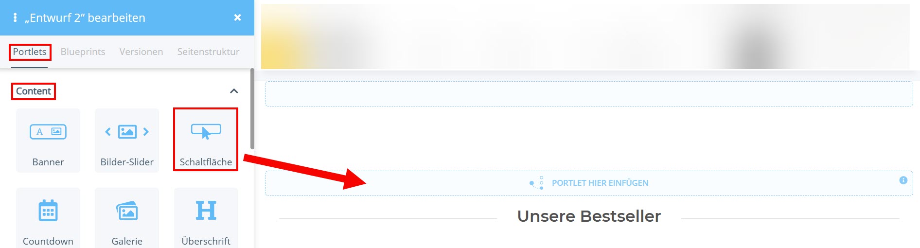 - Klicken Sie in der Registerkarte Portlets im Bereich Content auf die Kachel Schaltfläche und fügen Sie die Schaltfläche per Drag and Drop Ihrem Onlineshop hinzu.