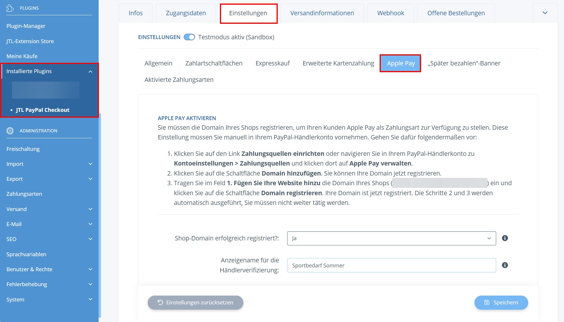Shop-Domain erfolgreich registriert?: Wählen Sie in diesem Dropdown-Menü die Option Ja, nachdem Sie Ihre Shop-Domain registriert haben. Lesen Sie mehr zum Thema hier: PayPal-Plugin installieren und konfigurieren.