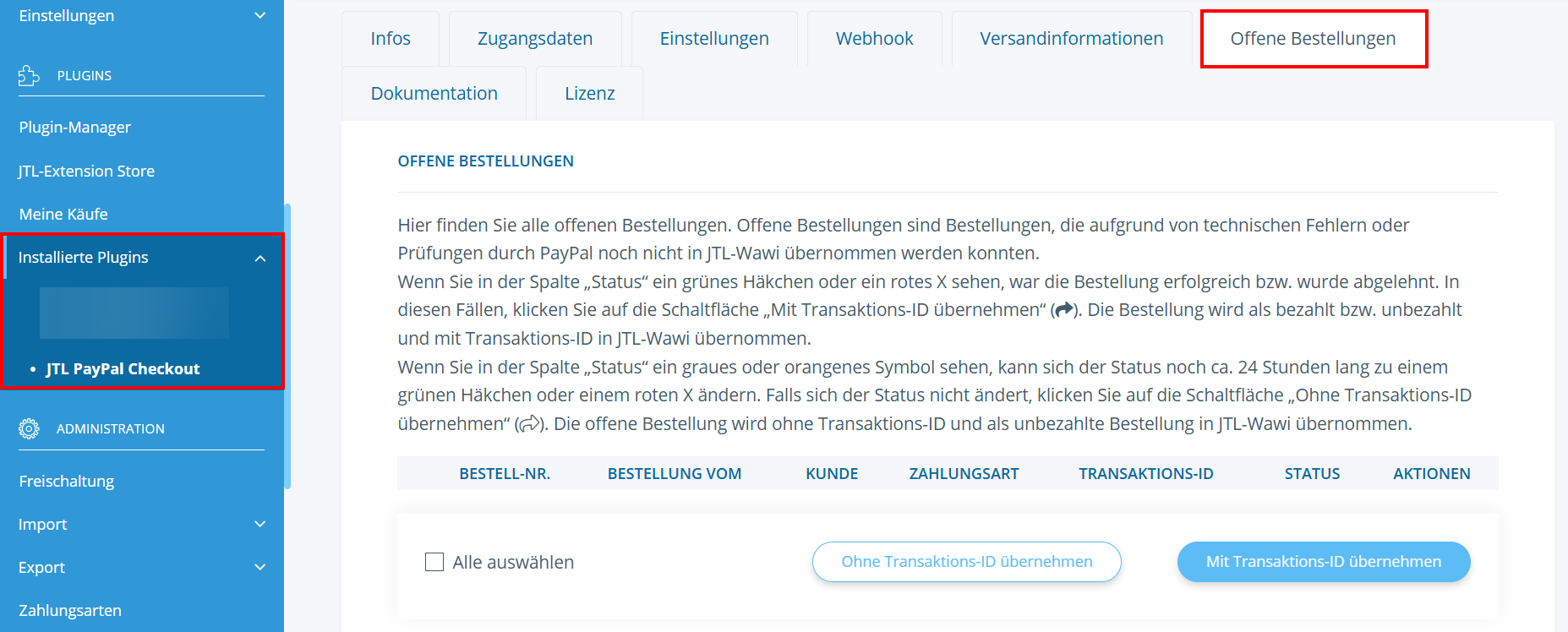 Aktionen: In dieser Spalte können Sie die offene Bestellung über die entsprechenden Schaltflächen aktualisieren, ohne Transaktions-ID übernehmen oder mit Transaktions-ID übernehmen.
