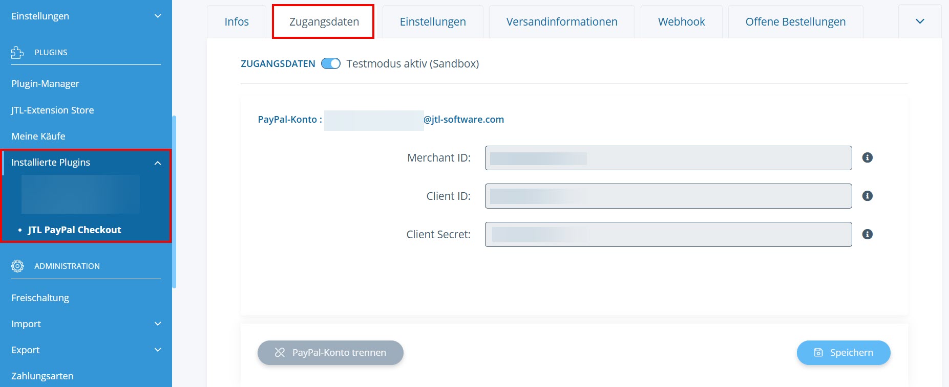 In dieser Dokumentation lesen Sie eine Detailbeschreibung der Funktionen im Bereich JTL PayPal Checkout. Sie erreichen diesen Bereich im Backend Ihres JTL-Shops über Plugins > Installierte Plugins. Er umfasst die Registerkarten Infos, Zugangsdaten, Einstellungen, Versandinformationen, Webhook, Offene Bestellungen, Dokumentation und Lizenz.