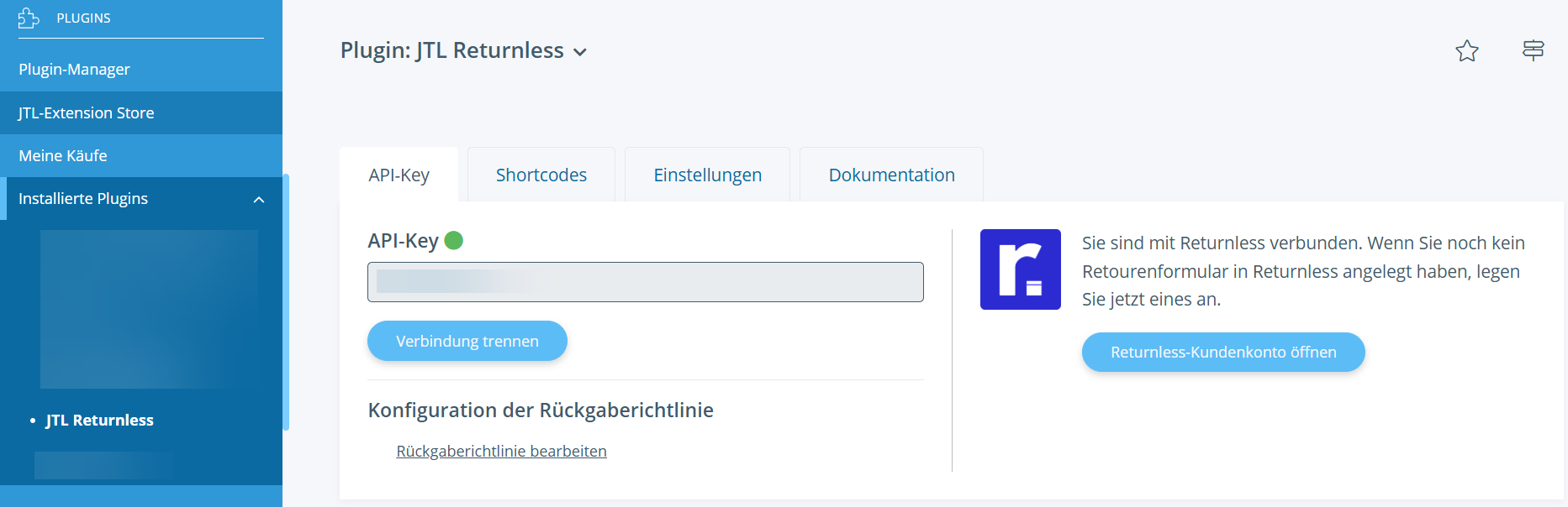 In dieser Dokumentation lesen Sie eine Detailbeschreibung der Funktionen im Plugin JTL Returnless. Sie erreichen diesen Bereich im Backend Ihres JTL-Shops über Plugins > Installierte Plugins > JTL Returnless. Er umfasst die Registerkarten API-Key, Shortcodes, Einstellungen und Dokumentation.
