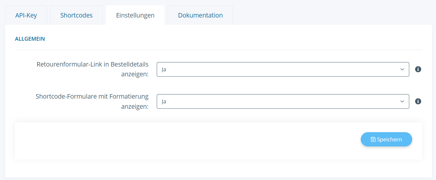 Shortcode-Formulare mit Formatierung anzeigen: Legen Sie fest, ob Returnless-Retourenformulare, die Sie über einen Shortcode eingebettet haben, mit einer vordefinierten Formatierung angezeigt werden sollen. Wenn Sie die Formatierung individuell anpassen möchten, empfehlen wir die Einstellung auf Nein zu setzen.