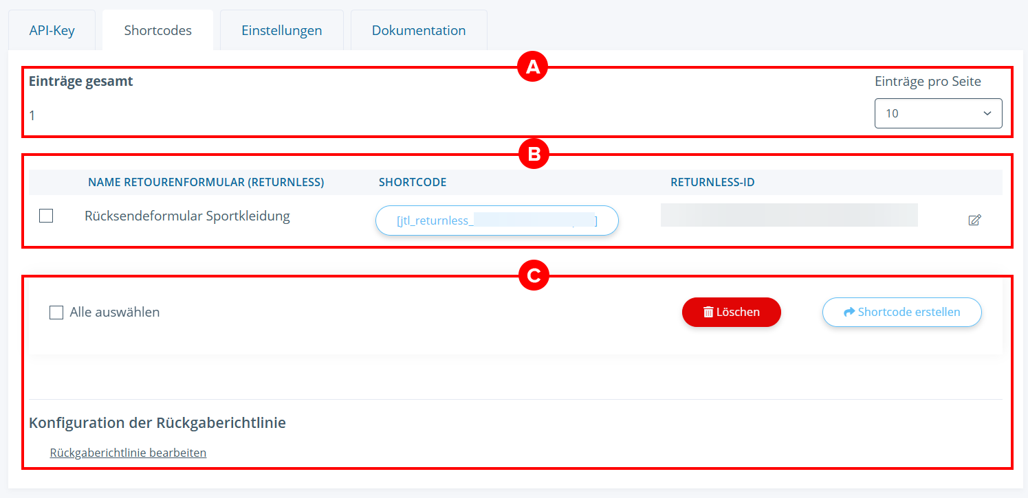 Einträge gesamt: Gesamtanzahl der Shortcodes, die Sie im JTL Returnless-Plugin erstellt haben.